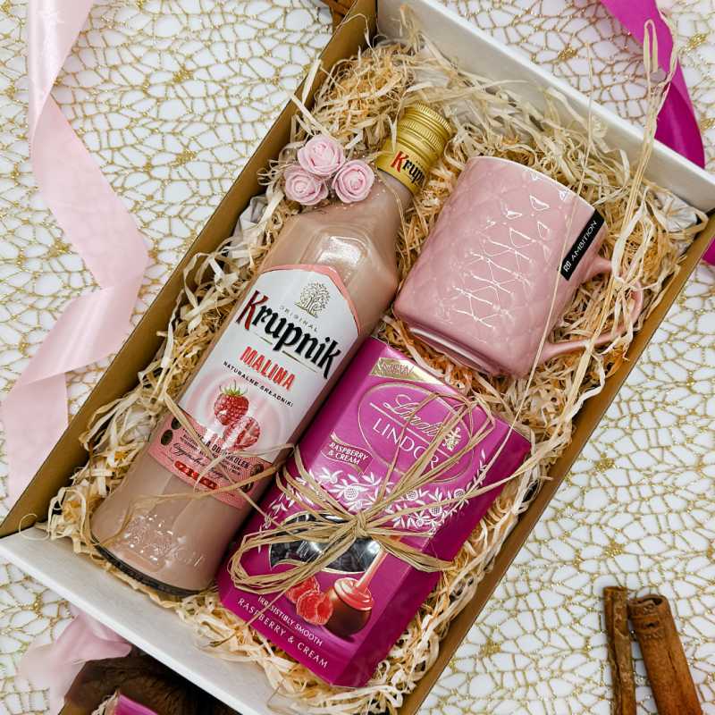Pink Raspberry Dream Box to kobiecy zestaw prezentowy z likierem Krupnik Malina, pralinkami Lindt Raspberry & Cream i eleganckim różowym kubkiem. Idealny na prezent dla niej.